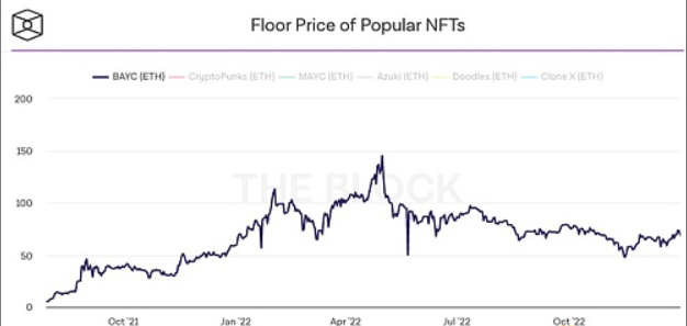 根据The Block的数据,Yuga Labs支持的NFT项目Bored Ape Yacht Club (BAYC) 年底的底价约为69ETH,即82,740美元。 BAYC 在今年的所有 NFT 项目中保持着最高的底价,仅在 11 月短暂低于其同类 Yuga Labs 系列 CryptoPunks,然后再次上涨。5月,BAYC的底价达到144.9 ETH,价值409、720美元。