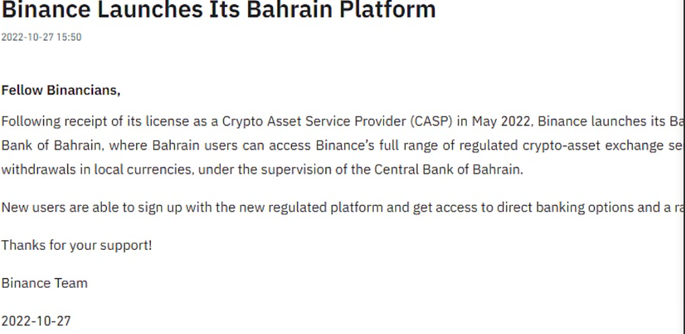 继2022年5月获得巴林中央银行加密资产服务提供商(CASP)许可证后,Binance宣布推出其巴林平台binance.bh。该平台受巴林中央银行全面监管,巴林用户可以在巴林中央银行的监管下访问Binance的所有受监管的加密资产交易服务以及当地银行选项,包括当地货币的直接存款和取款。