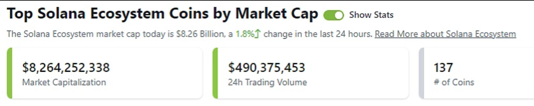 据CoinGecko最新数据显示,当前Solana生态总市值约为82.64亿美元(截至发稿时为8,264,252,338美元,24小时增涨1.8%),24小时交易额约为4.9亿美元(截至发稿时为490,375,453美元)。