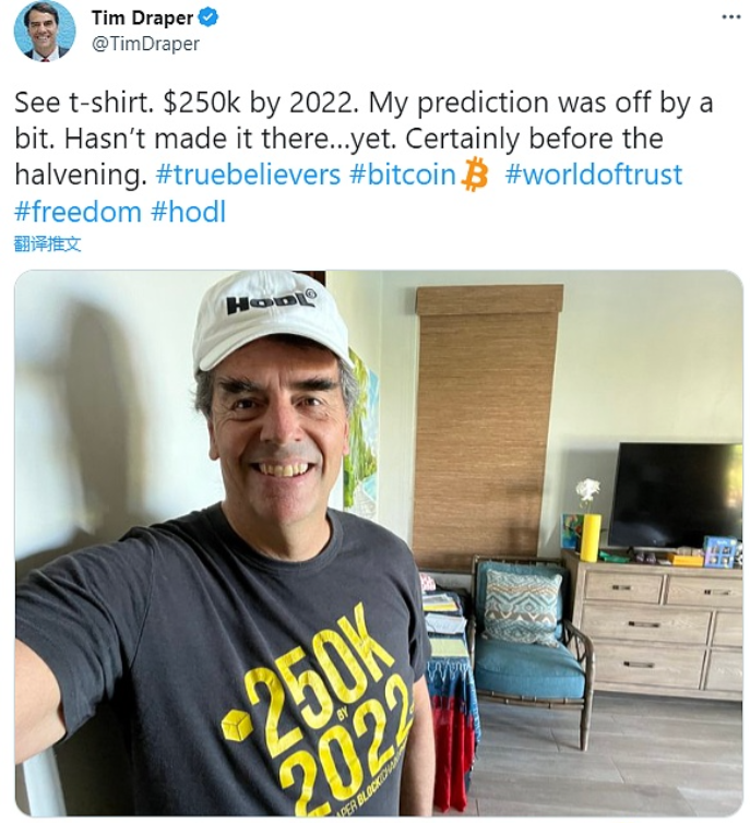 风险投资家Tim Draper最近谈到了他经常重复的关于比特币价格达到250,000美元的预测。虽然加密货币还没有涨到那么高,但他仍然乐观地认为,这一预测将在即将到来的减半之前实现。这位亿万富翁风险投资家和加密爱好者透露,他穿着一件印有“250K by 2022”标语的T恤,表明他对数字货币的信心。