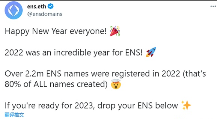 ENS在推文中表示,2022年对ENS来说是不可思议的一年,2022年注册了超过220万个ENS名称(占创建的所有名称的80%)。