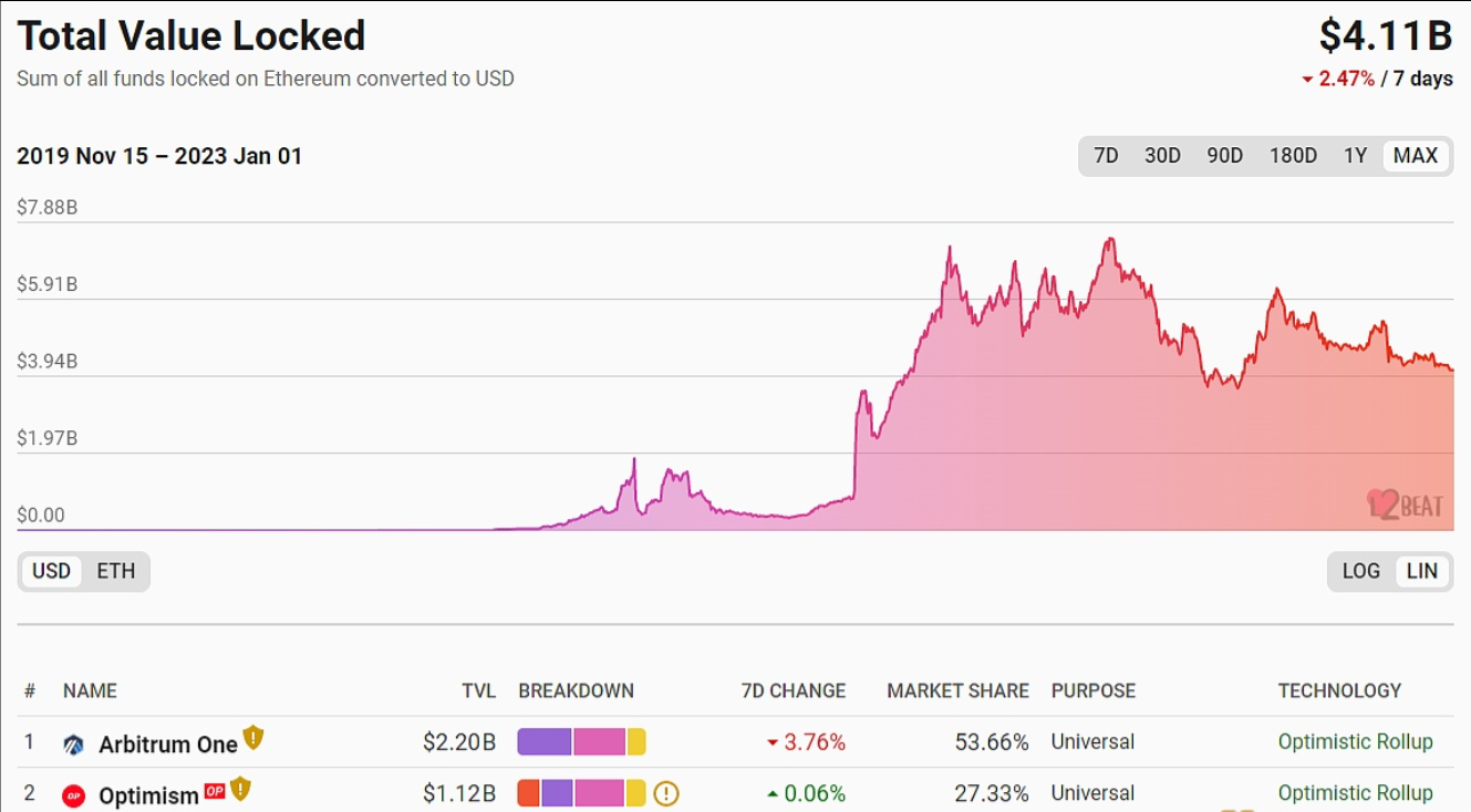 L2BEAT数据显示,截至目前,以太坊Layer2上总锁仓量跌至41.1亿美元,7日跌幅2.47%。其中锁仓量最高的为扩容方案Arbitrum,锁仓量为20.2亿美元,占比53.66%;其次是Optimism,锁仓量为10.12亿美元,占比27.33%;第三为dYdX,锁仓量为3.86亿美元,占比9.39%。
