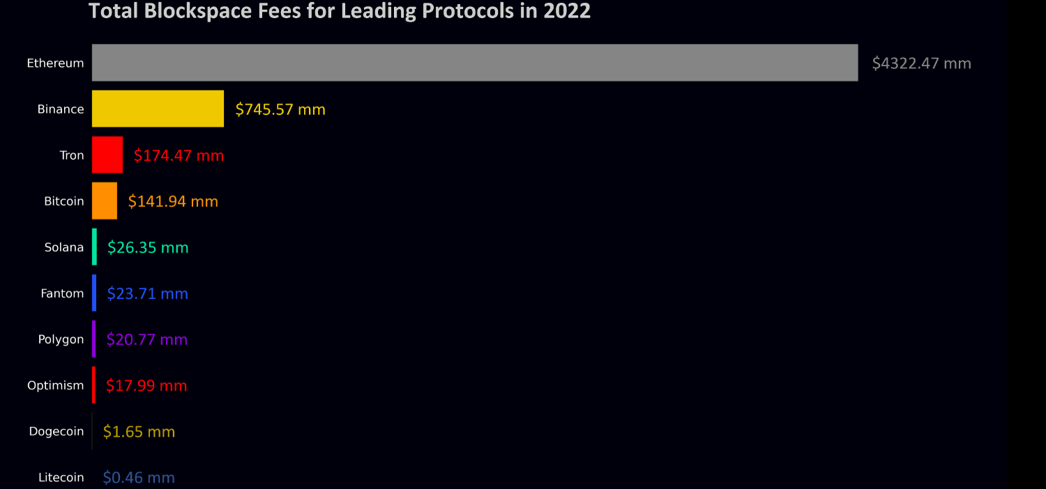 1月3日消息,加密研究员Data_Always发布文章表示,2022年以太坊占据所有区块空间费用的80%,BNB Chain占据了剩余费用的80%,而最大的简单传输模型(Bitcoin、Dogecoin和Litecoin)相比之下仅占微不足道的费用。在Otherdeed NFT铸造的一天里,以太坊上产生的费用就超过了2022年比特币全年费用。 L2使用的Gas份额增加了两倍,但采用率仍不高,但随着EIP-4844的推出可能会改善。对于以太坊而言,必须继续扩展并优先考虑协议的可用性,尽管费用将始终是KPI,但扩展速度比采用速度快是新的目标,这将是推高价格和巩固以太坊在加密生态系统的关键。 尽管采取补贴交易模式,Tron在区块空间需求上仍超过了比特币,并且全年费用保持相对稳定,最重要原因是Tron对低价值USDT转账的捕获。比特币闪电网络尚未看到有意义的增长,对闪电网络采用预期过于乐观,大部分交易费用峰值可归因于加密机构的崩溃。
