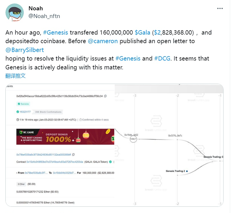 1月3日消息,链上分析师Noah发推表示,Genesis在1小时前向Coinbase充值1600万枚Gala,价值约282万美元。该分析师认为Genesis或许正在积极处理Gemini的流动性问题。金色财经此前报道,Gemini联创致信DCG创始人,要求其偿还Earn用户逾9亿美元。