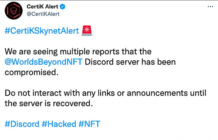 据CertiK监测,NFT项目Worlds Beyond Discord服务器遭到攻击。请社区用户在服务器修复之前不要点击其发布的任何链接。