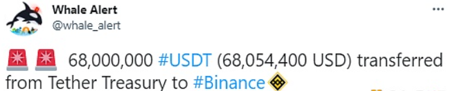 Whale Alert数据显示,68,000,000枚USDT从Tether Treasury到Binance。