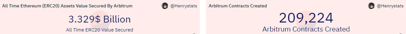 据 Dune Analytics 数据显示,以太坊 Layer2 扩容解决方案 Arbitrum 链上合约创建总量已突破20万个,本文撰写时为209,224个,链上锁定的ERC20数字资产总规模达到33.29亿美元。此外,Arbitrum当前跨链桥接存储总价值已达到1,929,248枚 ETH,按照当前 ETH 价格计算超过 31亿美元。
