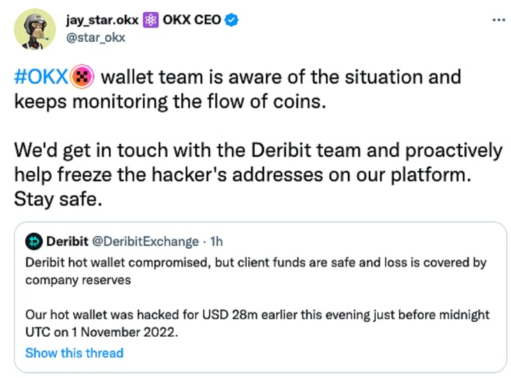 11月2日消息,OKX CEO Jay Hao在社交媒体上称,将与Deribit团队取得联系,并主动帮助冻结黑客在我们平台上的地址。此前,赵长鹏表示已要求团队监控并帮助冻结任何转移到币安的 Deribit 被盗资金。