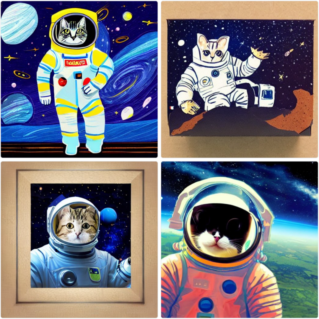 这里突然想让通义万相与大名鼎鼎的 Stable Diffusion 较量一下。同样的文字描述翻译成英文「cat in a spacesuit, space, travel, starry sky」,然后再加上「style of 3D carton」,生成的图片是下面这样的。