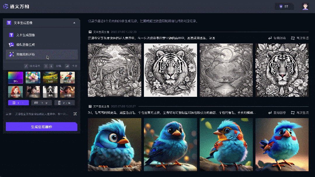 目前,通义万相上线了文本生成图像、相似图像生成和图像风格迁移三大功能。