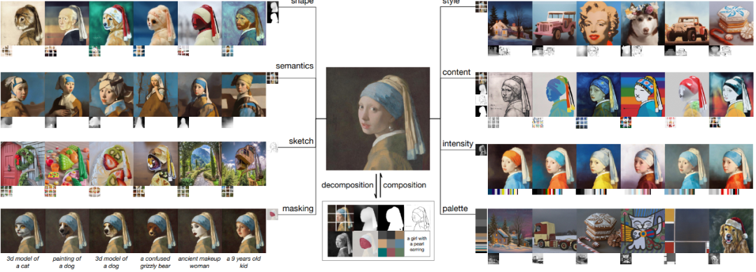 所谓拆解 – 组合,首先将图像分解为不同的设计元素,比如配色、草图、布局、风格、语义、材质等。然后使用 AI 模型将这些设计元素重新组合成新的图像。这里,拆解 – 组合过程中允许对用到的元素自由修改编辑,如此一来可控性大大增强。