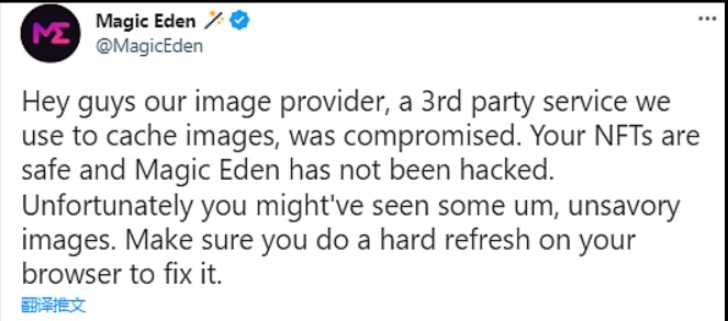 1月4日消息,Solana链上NFT市场Magic Eden在推特上表示:“我们的图像提供商(用来缓存图像的第三方服务)被攻击,Magic Eden没有被黑。用户可能已在平台上看到了一些令人不快的图片,请确保对浏览器进行硬刷新来修复它。”