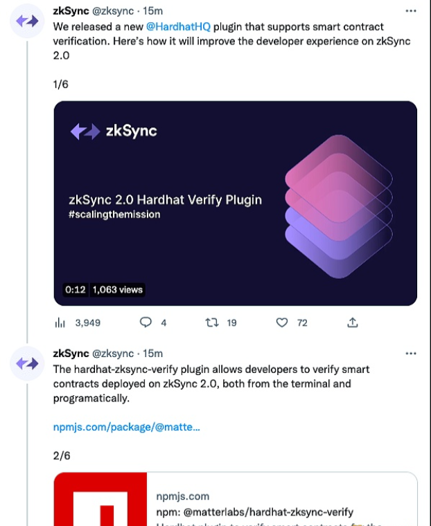 基于ZK Rollup的以太坊二层网络zkSync宣布发布了一个新的支持智能合约验证的插件。hardhat-zksync-verify插件允许开发人员从终端和编程方式验证部署在 zkSync 2.0 上的智能合约。