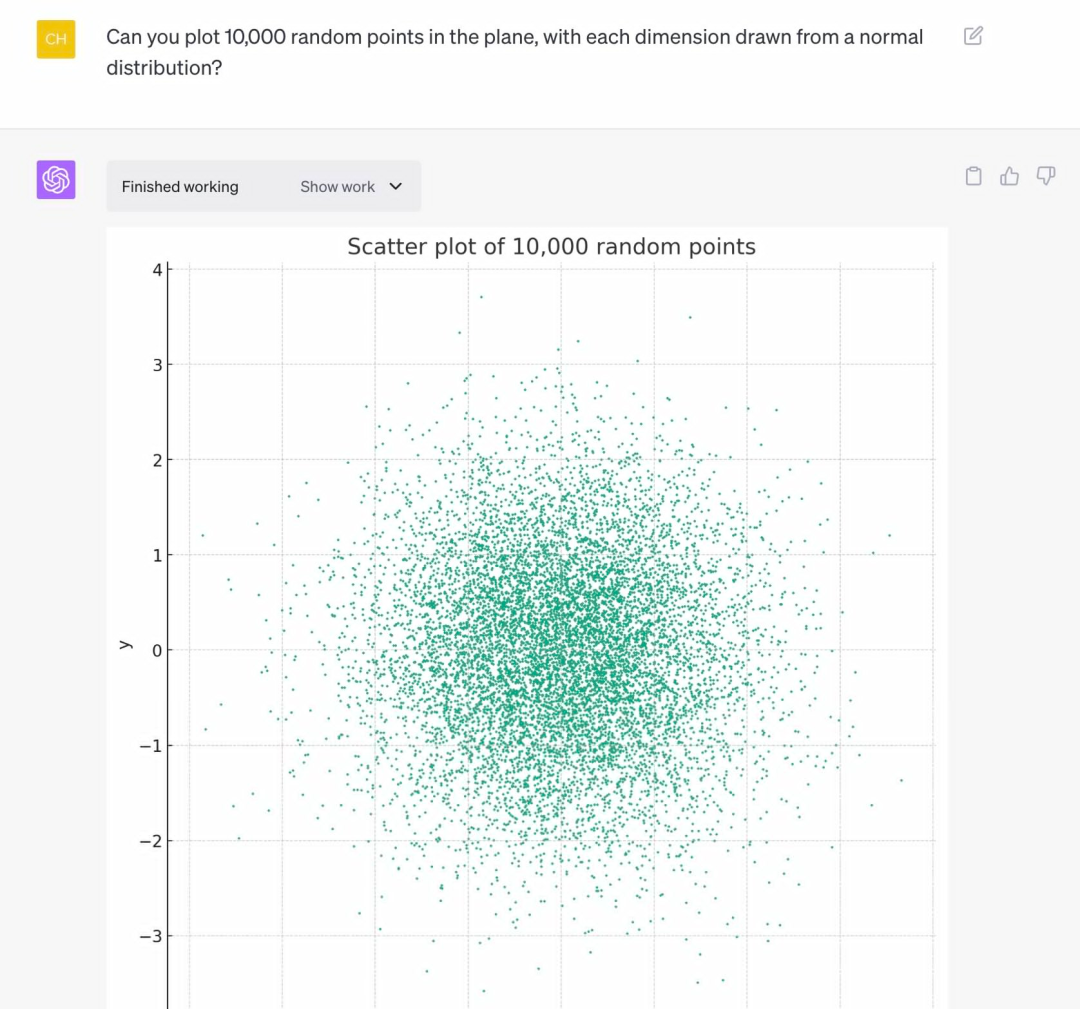 Ethan Mollick 明确表达了两点感想:1)Code Interpreter 工作得非常好,不像插件那样完全是偶然的;2) 提示制作通常是没有必要的,用户只需与 AI 讨论代码或数据以及想要什么就可以了。