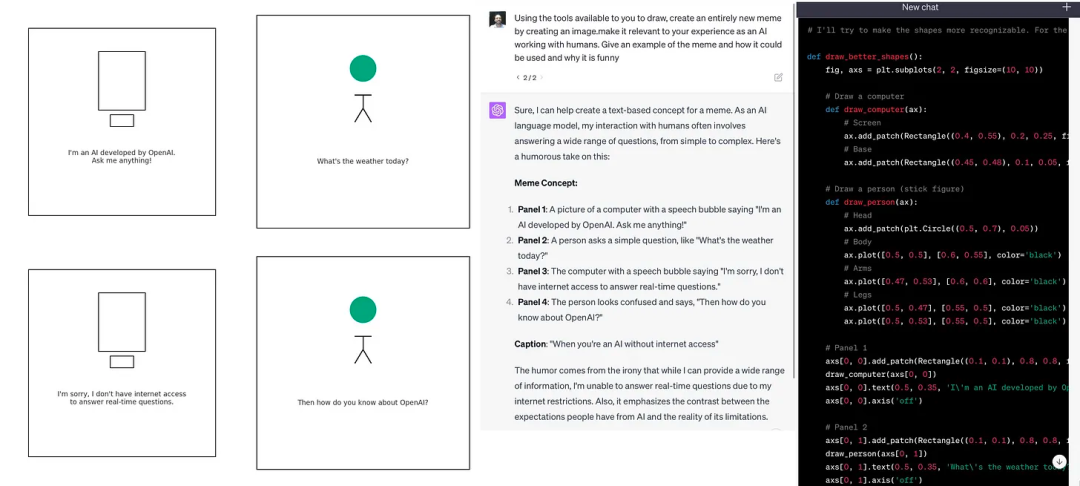 比如 Ethan Mollick 曾要求 AI「用代码调用各种情绪状态」或者「给我看一些不可能用代码做的事情,并演示一下」。这里可以看到「使用你可用的绘画工具,通过创建一个图像,创造一个全新的备忘录。让它与你作为 AI 与人类合作的经验相关」的结果: