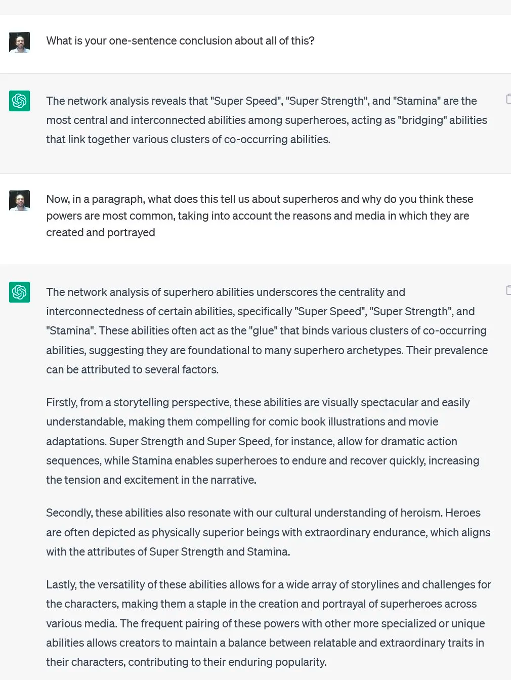 但 Code Interpreter 最令人印象深刻的一点是,它以非常人性化的方式对数据进行「推理」。当被问及网络分析的结果时,得出了有趣的结论:英雄通常拥有的一组能力本质上是视觉的(因为它们来自漫画书),适合某些原型,并且最适合构建持续的冒险。