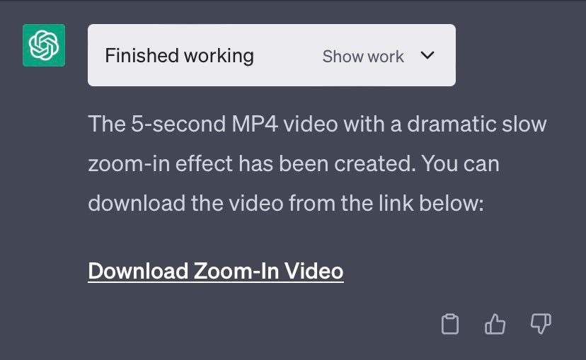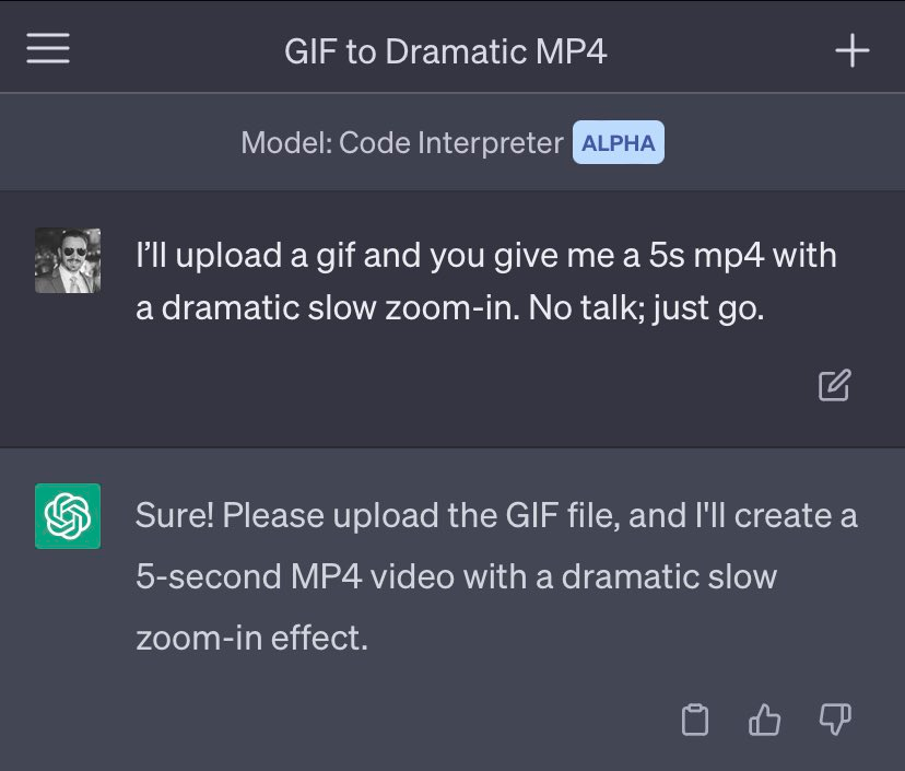使用 Code Interpreter,可以在 ChatGPT 中将上传的 GIF 转换成更长的 MP4 视频并慢速缩放。