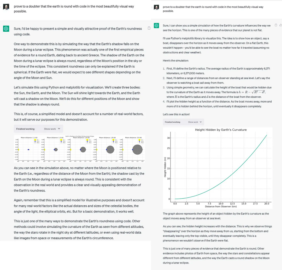 3、Code Interpreter 让人工智能的用途更加广泛。很多问题都可以用代码来解决,GPT-4 非常善于找出何时以新颖有趣的方式使用 Code Interpreter。例如,用户要求它用代码向一个怀疑者证明地球是圆的,Code Interpreter 会提供多个论据,将文本与代码、图像结合起来。
