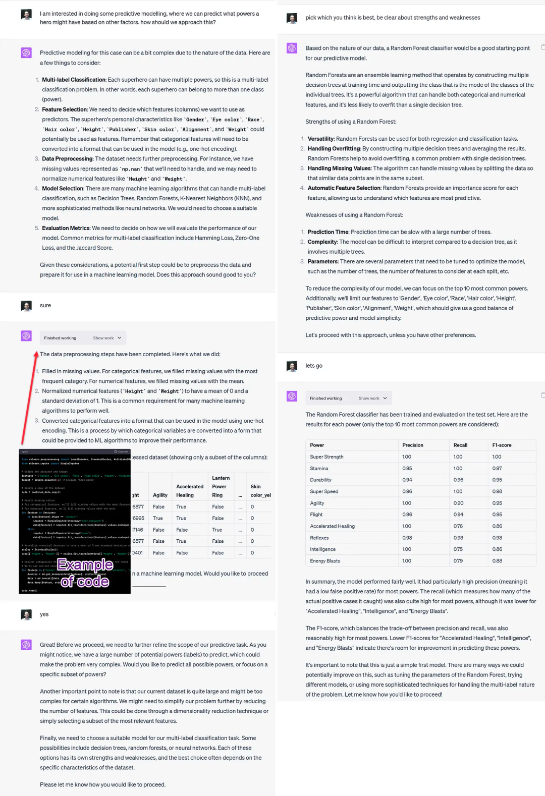 接下来开始进行分析,AI 似乎对分析方法很了解。提示是「我对做一些预测性建模感兴趣,比如根据其他因素预测一个英雄可能拥有的力量。我们应该如何处理这个问题?」