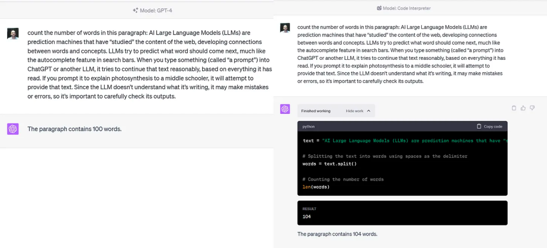 同样的 prompt,Code Interpreter 的字数统计结果是 104 个词。