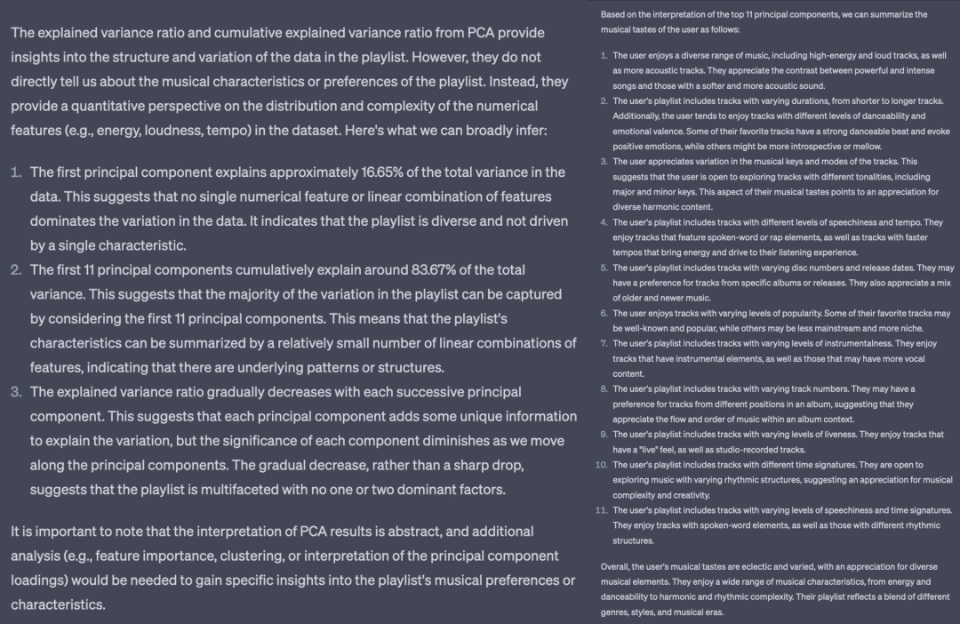 使用 Code Interpreter 分析 300 小时的 Spotify 收藏夹播放列表,从 Spotify API 中导出,并运行多维 PCA 和 t-SNE 分析,总结音乐品味。