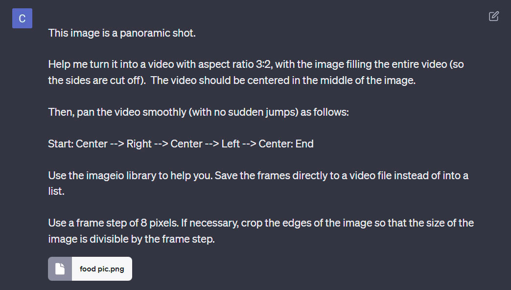 然后要求 AI 从左到右为这张食物图像制作动画。通过修改提示,可以创建自己的动画。点击回车,30 秒即可获得视频: