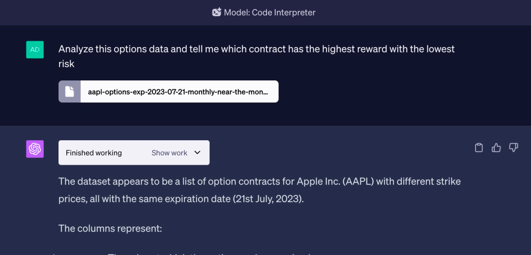 用 Code Interpreter 来分析 7 月 21 日到期的 AAPL 的期权: