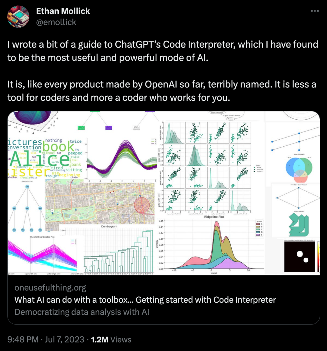 宾夕法尼亚大学沃顿商学院的教授 Ethan Mollick,是一位拥有数月 Code Interpreter Alpha 版本试用经验的 ChatGPT Plus 用户。他对 Code Interpreter 的评价还是比较高的,称之为「用过的最有用、最有趣的 AI 模式」。