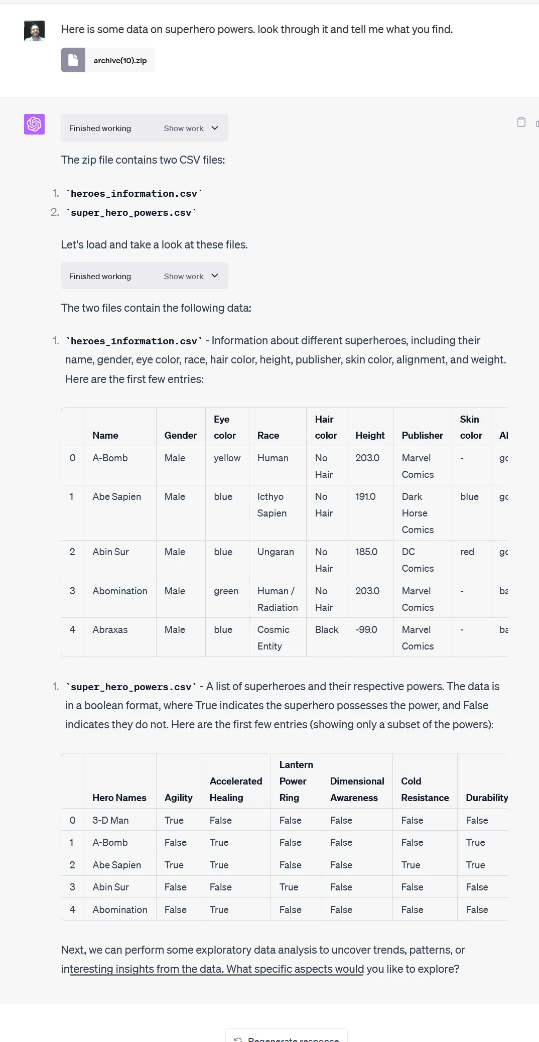 你应该在数据中加入一个初始提示,但它可以是相当少的,Ethan Mollick 用的 prompt 是这里有一些关于超级英雄力量的数据,翻看一下,告诉我你发现了什么」,然后得到了不错的结果。如果你有一个数据字典,也可以直接粘贴进去。AI 很善于仅从上下文中找出数据的含义和结构。