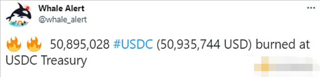 Whale Alert数据显示,USDC Treasury销毁50,895,028枚USDC。