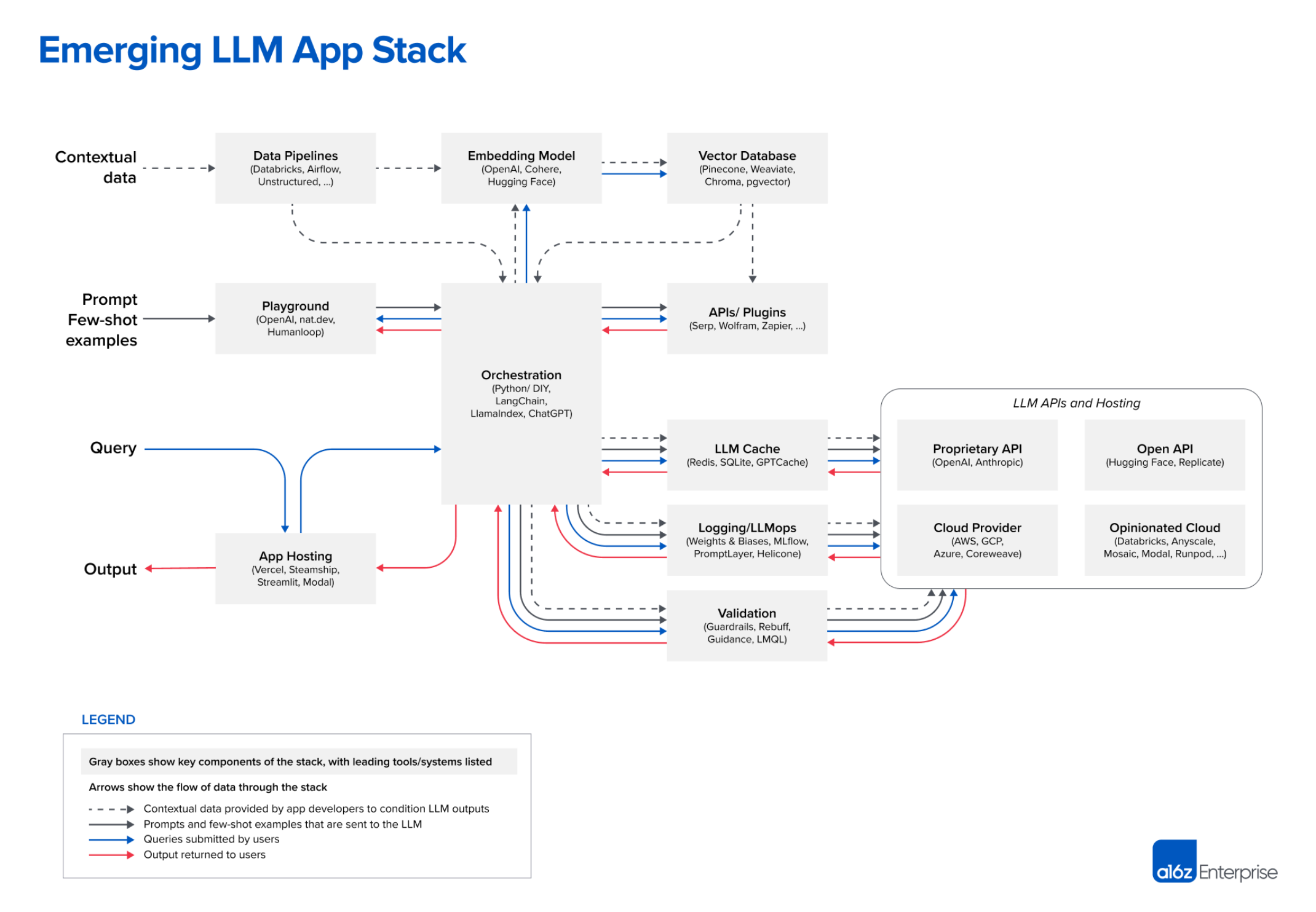 用 LLM 进行开发的方法有很多种,包括从零开始训练模型、微调开源模型或利用托管 API。我们展示的技术栈是基于上下文学习(in-context learning),我们观察到大多数开发者都开始利用的这种设计模式(并且目前只能通过基础模型实现)。
