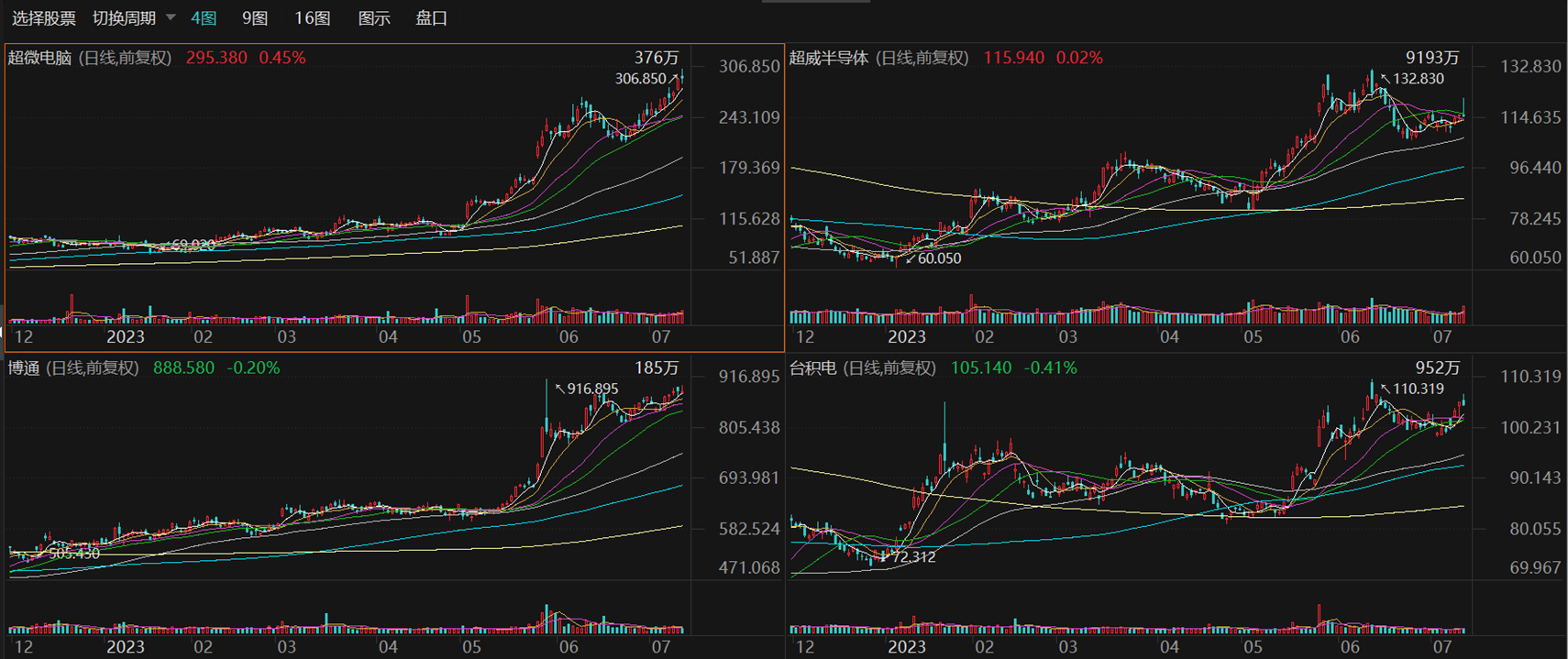 超微电脑、博通等公司美股股价同样在近日继续攀升,前者也在上周五创下股价历史新高,年内涨幅逼近260%。