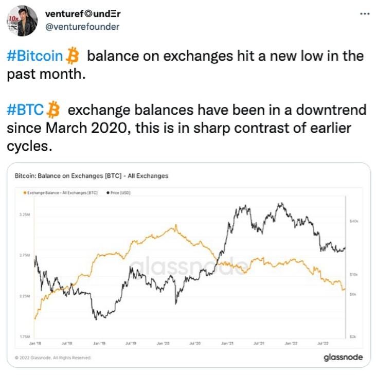 分析师Venturefounder发推称,交易所的比特币余额在过去一个月中创下新低。BTC交易所余额自2020年3月以来一直处于下降趋势,这与早期周期形成鲜明对比。