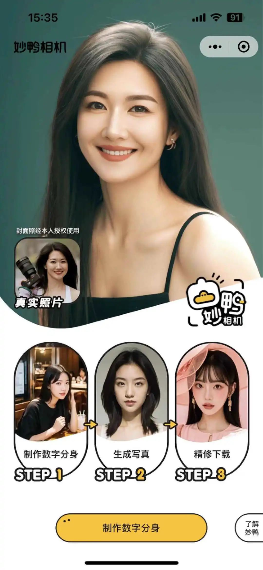 妙鸭的收费模式是9.9元生成数字分身,挑选模板后生成照片,用户如需下载则要另外付费。此外,市面上还存在按照生成时长收费方式,等待时间越短,付费越高;按照用户会员制收费,分为包周和包年;按照次数收费,每次生成照片都会扣除相应的费用。