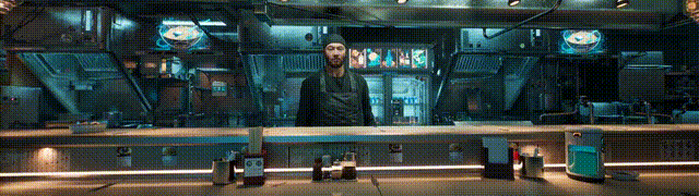 在一个充满「赛博朋克」风格的拉面店场景中,玩家按下一个按钮,可以用自己的声音说话,然后店主Jin会进行回答。