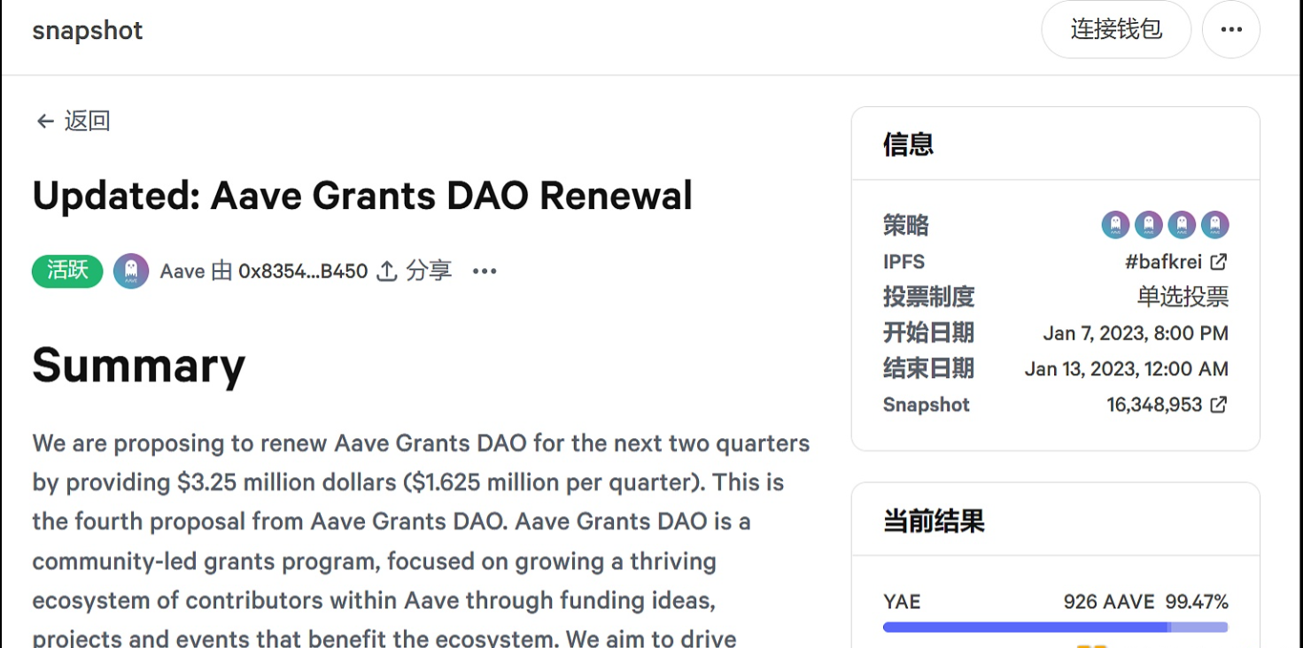 Aave Grants发推称,更新Aave Grants DAO的提案正在Snapshot进行投票,该提案建议在未来两个季度为其提供325万美元(每季度162.5万美元)预算资金。这是Aave Grants的第四项提案,旨在通过资助有才华的建设者和培养Aave的文化来推动发展、吸引最佳贡献者并确保Aave的长期发展。提案投票将于1月13日结束。