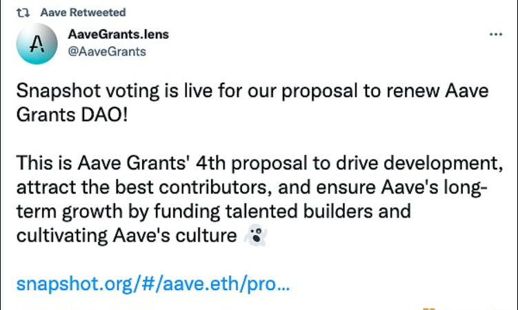 Aave Grants在社交媒体上称,我们更新Aave Grants DAO的提议正在进行快照投票。这是Aave Grants的第四项提案,旨在通过资助有才华的建设者和培养 Aave 的文化来推动发展、吸引最佳贡献者并确保 Aave 的长期发展。