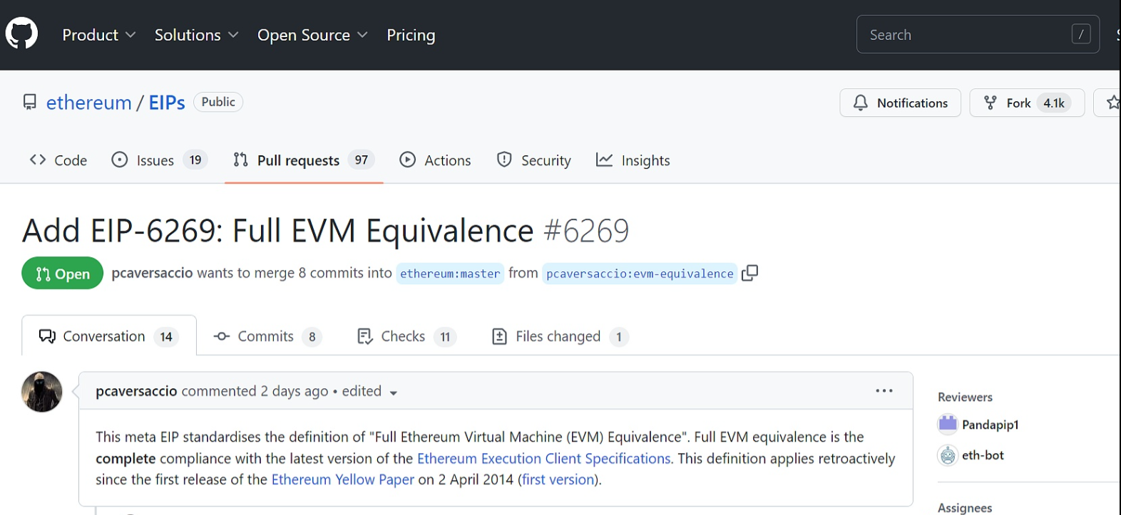 以太坊开发者@pcaversaccio发推称,近期起草并提交了EIP-6269,该提案标准化了“完全等效EVM”的定义。据了解,EVM等效性实现了“一次编码,随处部署”的可行性,使得现有的以太坊堆栈能够与L2系统直接集成,不管是调试工具、节点客户端实现还是EIP标准。