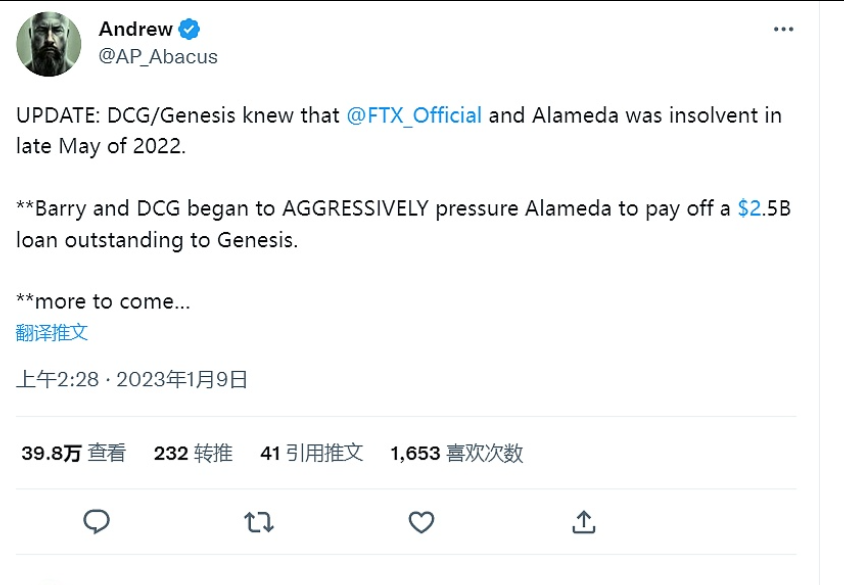 推特用户Andrew援引消息人士表示,DCG/Genesis知晓FTX和Alameda在2022年5月下旬资不抵债,Barry和DCG开始积极向Alameda施压,要求还清欠Genesis的25亿美元贷款。