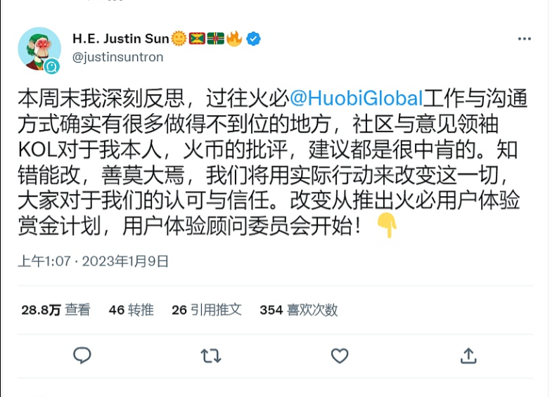 1月9日消息,波场创始人孙宇晨发推表示,他于周末深刻反思,过往火必工作与沟通方式确实有很多做得不到位的地方,社区与 KOL 对于我本人,火币的批评,建议都是很中肯的。 火必将推出用户体验赏金计划,社区,KOL,用户可以通过客服,火必推特,微博,火必社交账户 ,随时提出关于火必资产,功能、运营、用户体验等各方面的批评与建议,由团队定期进行评估,提议被采纳的用户将获得大礼包与赏金奖励。 此外,火必将成立用户体验顾问委员会,邀请业内知名的意见领袖KOL,资深用户成为火必用户体验顾问委员会顾问,邀请他们近距离体验火币产品,了解火币运营,监督火币透明度。
