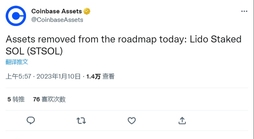 1月10日消息,据官方推特,Coinbase宣布从上币路线图中移除Lido Staked SOL (STSOL)。 此前去年12月份消息,Coinbase将上述资产添加至上币路线图。