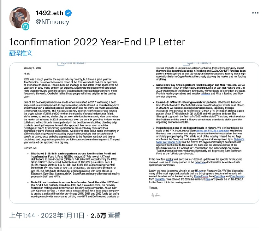1月11日消息,风投机构1confirmation创始合伙人Nick Tomaino在社交媒体上公布其年终LP信件,其中指出,1confirmation Fund I、Fund II向合作伙伴分配了1.19亿美元现金,目前仍持有以太坊、OpenSea、Cosmos、dYdX、SuperRare等项目的大量股份和代币。 此外,Fund I现在的净分配为实收资本(DPI)的4.47倍,内部回报率(IRR)为144.28%;Fund II现在的净分配为实收资本(DPI)的1.2倍,内部回报率(IRR)为173%。Fund III和NFT Fund已进行了15项新投资,NFT Fund已部署25%的资金。
