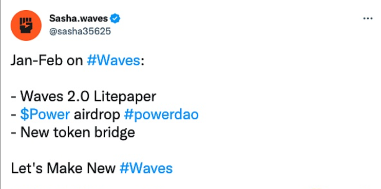 1月12日消息,Waves创始人Sasha Ivanov发推称,Waves将于今年1月至2月发布Waves 2.0 Litepaper、进行Power DAO的Power代币空投、创建新代币跨链桥。 据此前报道,去年12月,Waves创始人Sasha Ivanov在推特上发布2023年Waves 2.0的叙事规划,包括利用概率共识POS机制在L1上实现TPS突破1000并保持完全去中心化,利用多链EVML2连接不同L1,推出基于KPI治理的Power DAO平台,基于可预测行为和风险/回报率的DeFi模型SafeFi,以及推出基于自适应DAO治理的稳定币。