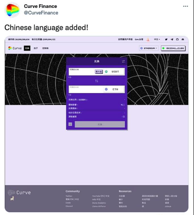 据官方消息,Curve Finance宣布为dApp界面语言加入原生中文选项。