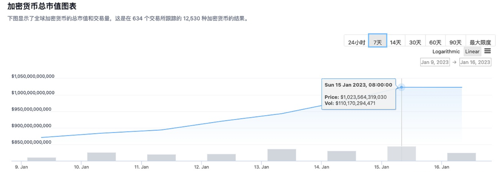 1月16日消息,据CoinGecko数据显示,1月15日加密市场总交易量为1101.7亿美元,相较于 1 月 14 日(752.93 亿美元)单日涨幅 46.4%。
