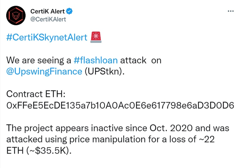 据CertiK监测,UpSwing Finance (UPStkn) 项目遭到闪电贷攻击。据悉,该项目从2020年10月以来处于非活跃状态,并且遭受了价格操纵攻击,共计损失约22枚ETH(约3.55万美元)。 ETH合约地址: 0xFFeE5EcDE135a7b10A0Ac0E6e617798e6aD3D0D6