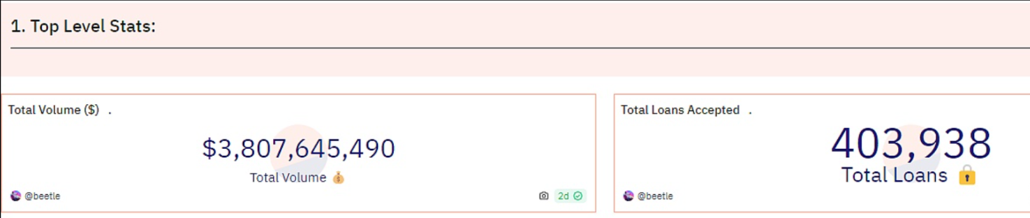 1月8日财经报道,据Dune数据显示,Blur旗下NFT借贷平台Blend贷款总量已突破40万笔,本文撰写时达到403,938笔,交易总额超38亿美元。此外,当前活跃贷款总量约5417笔,活跃贷款总量触及14,405 ETH。