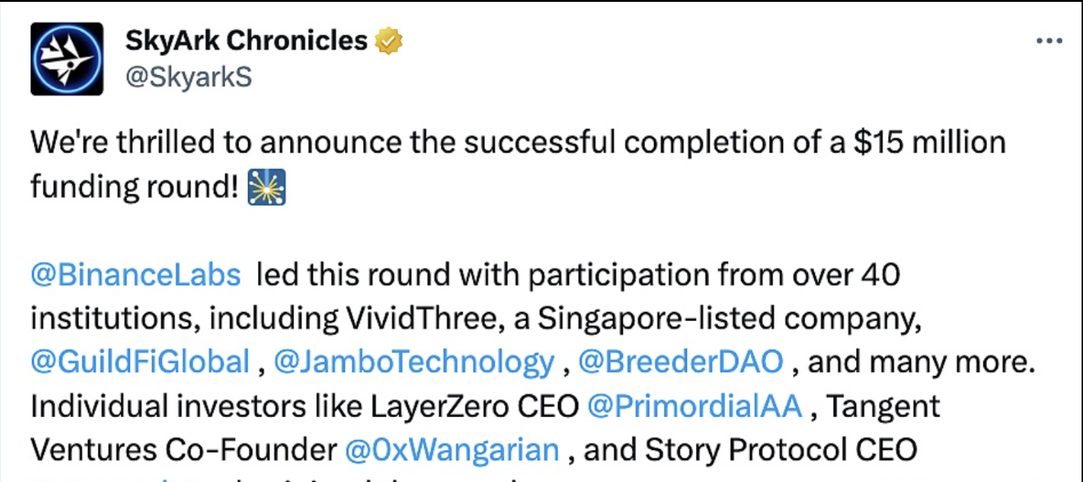 1月12日财经报道,3A游戏平台SkyArk Chronicles在社交媒体上表示,完成1500万美元融资,由Binance Labs领投,VividThree、GuildFi、Jambo、BreederDAO等40多家机构跟投。同时包括LayerZero首席执行官Brian Pelligrino,Tangent Ventures联合创始人Wangarian,Story Protocol首席执行官Lee Seung Yoon等个人投资者参与。