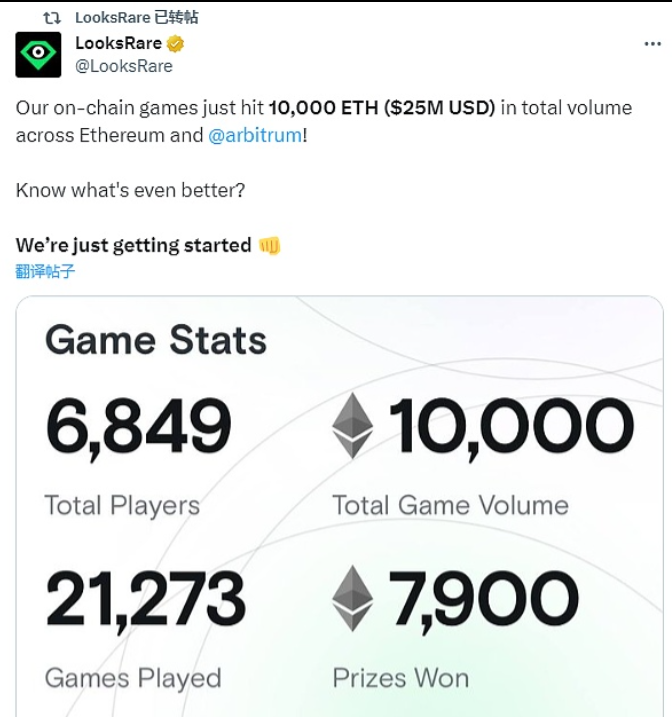 1月14日财经报道,据NFT市场LooksRare官方披露数据显示,旗下链上游戏在以太坊和Arbitrum区块链上的交易总额已达到1万枚ETH,价值约合2500万美元,参与游戏玩家总数为6849个,截至目前提供的游戏激励为7900枚ETH。