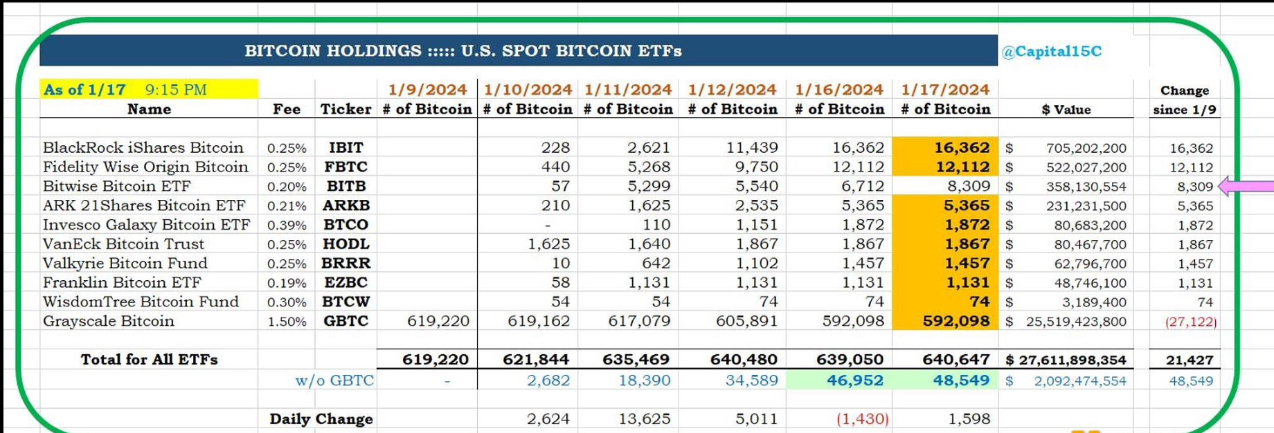 1月18日消息,CC15Capital数据显示,Bitwise比特币现货ETF昨日净买入1598枚比特币。截至1月17日,该ETF共持有8309枚比特币,约合3.58亿美元。